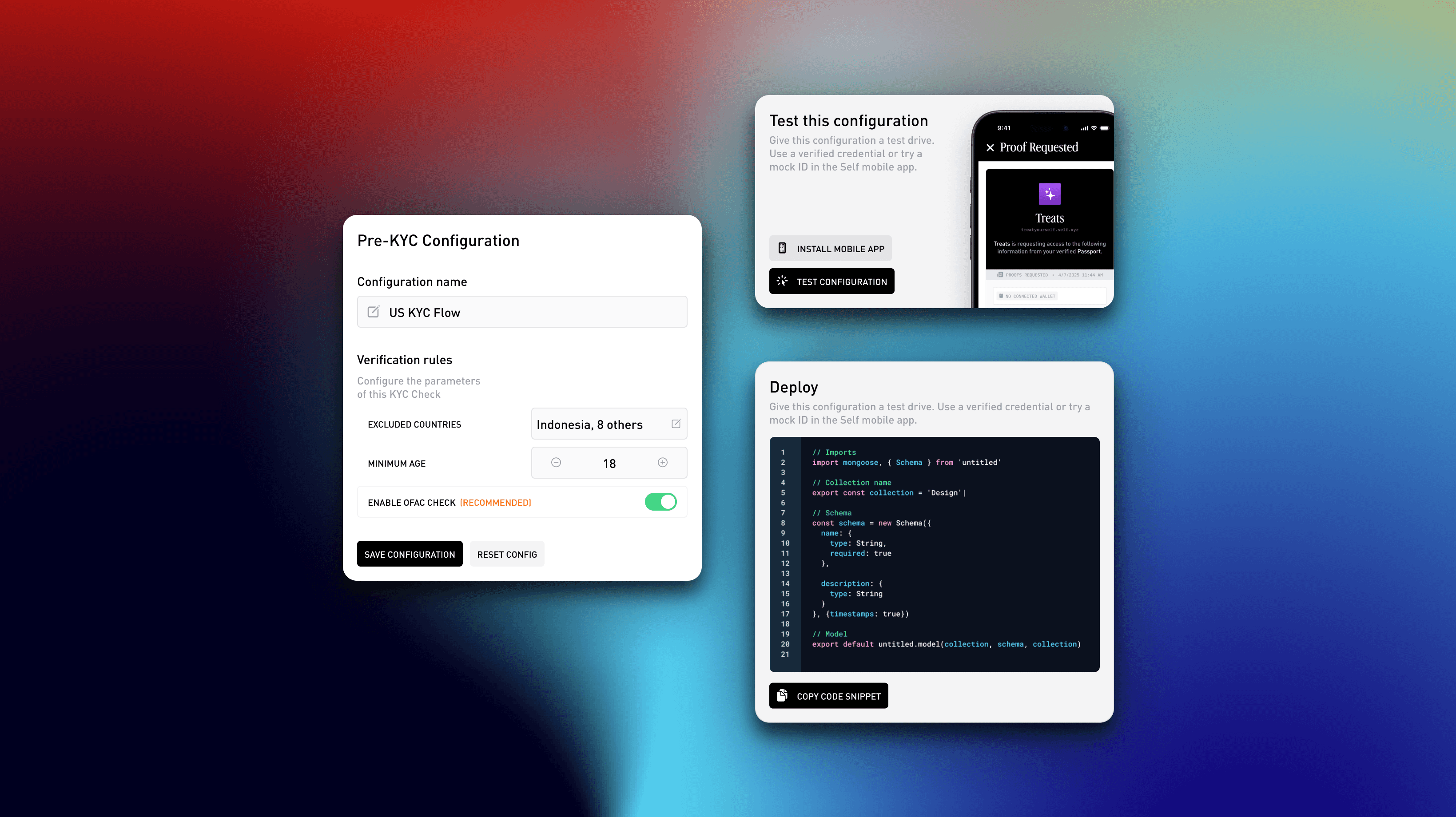 Self generates proofs on the user's device using their government-issued biometric ID. The output is a zero-knowledge proof that confirms a specific claim (that a user is over 18, or not from a restricted country) without transmitting the underlying data to anyone. Your servers receive cryptographic confirmation and nothing more. The user's personal data stays on their device, and your liability for rejected applicants drops to zero.